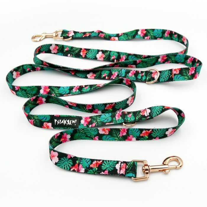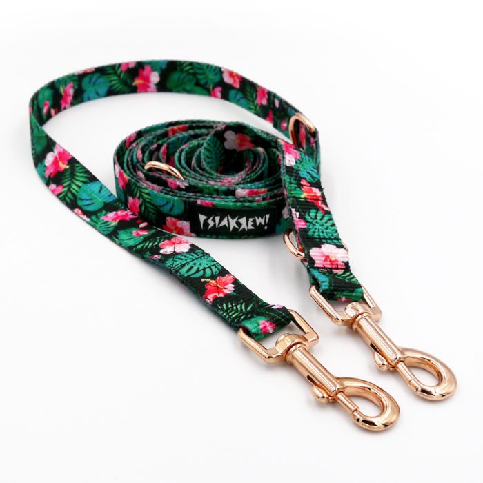 Leash for micro and small Dog; Tropical Monstera; adjustable; 2 cm wide, pink gold snap hook 6 cm