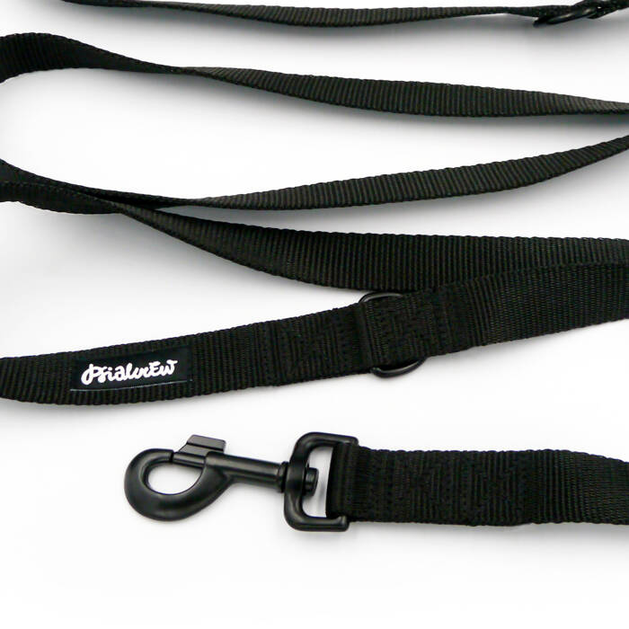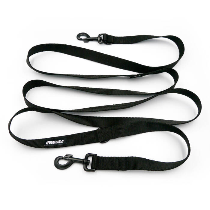 Long walking dog leash with tape width of 2,5 cm, black extras. It has a snap hook on each side, giving you the ability to adjust the length of the leash.