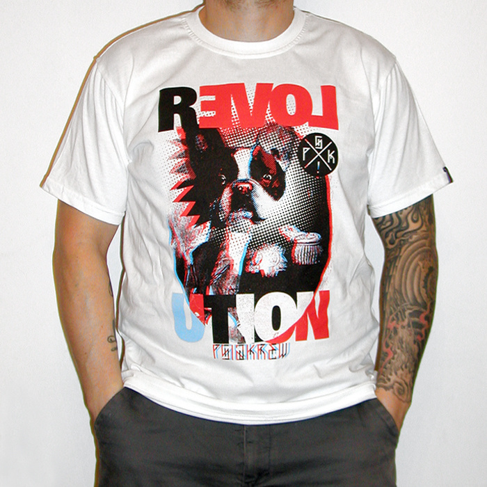Stand out from the crowd with our unique "Revolution" T-shirt! This retro-style designer tee with a modern twist is a true fashion statement. The front features a striking print of a French Bulldog, created with a halftone technique and a 3D anaglyph effect (red-blue). The composition is completed with a bold "REVOLUTION" text, with creatively arranged letters highlighted in black, red, and blue.