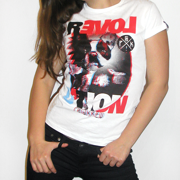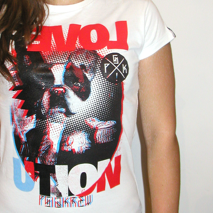 Stand out from the crowd with our unique "Revolution" T-shirt! This retro-style designer tee with a modern twist is a true fashion statement. The front features a striking print of a French Bulldog, created with a halftone technique and a 3D anaglyph effect (red-blue). The composition is completed with a bold "REVOLUTION" text, with creatively arranged letters highlighted in black, red, and blue.