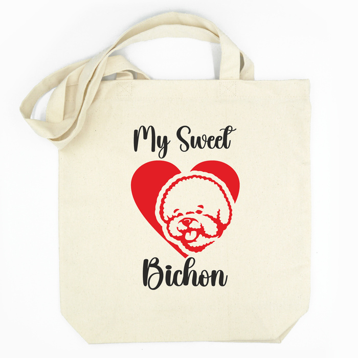 A stylish and practical tote bag made of high-quality cotton, perfect for shopping, work, or a walk with your pet. The front features an eye-catching print of a Bichon Frise dog inside a red heart, along with a decorative black inscription of your choice. This bag is not only a practical accessory but also a way to show your love for your favorite breed. An ideal gift for any Bichon Frise owner or dog lover.