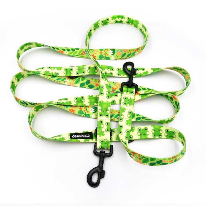 ZUBEHÖRSATZ. Großer Hund. Psiakrew Green Frogs-Serie; Halsband, Geschirr, Leine, Sachet für Hundeleckerli
