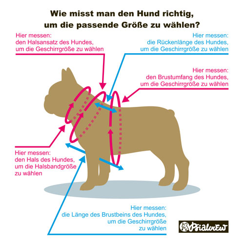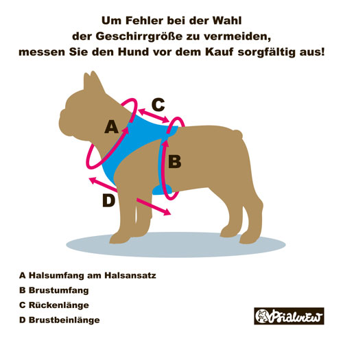 Welche Größe soll ich für meinen Hund wählen? Die wichtigste Dimension befindet sich an der Basis des Halses, wo die Hosenträger einrasten. Wir messen also den Halsumfang näher am Widerrist. Der Brustgurt ist verstellbar und kann auch alleine leicht gekürzt werden. Sollte sich nach dem Kauf herausstellen, dass das Gurtzeug nicht passt, können Sie es einfach durch eine andere Größe ersetzen oder zurückgeben.