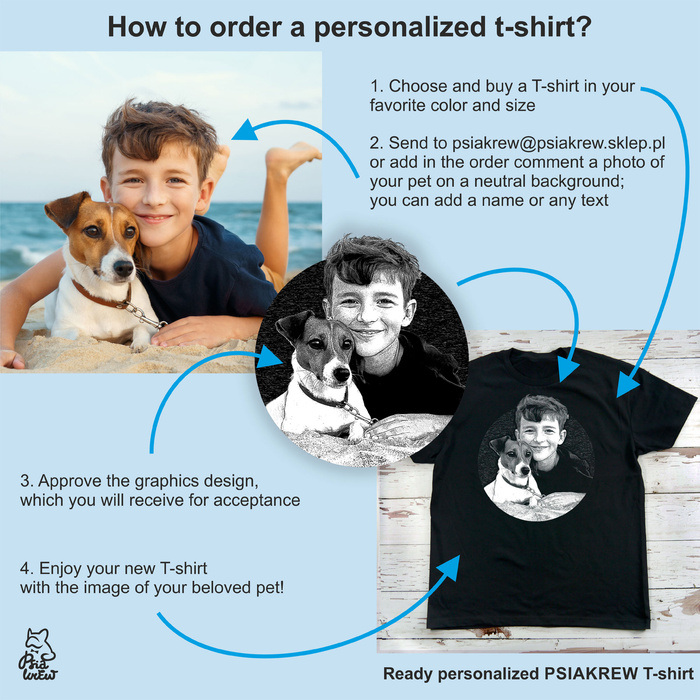 Um das T-Shirt zu personalisieren, benötigen wir ein qualitativ hochwertiges, hochauflösendes Foto Ihres Haustieres. Das Foto darf nicht unscharf sein und sollte vor einem neutralen Hintergrund (z. B. einer weißen Wand) aufgenommen werden. Sie können der Grafik eine beliebige Beschriftung hinzufügen – Name oder anderen Text. Mögliche Modifikationen, Farbänderungen und Hinzufügen grafischer Elemente zum Design nach Ihren Wünschen.