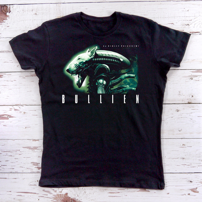 Bullterrier als Alien – Der achte Passagier eines bestimmten Raumschiffs :) Wir schreiben das Jahr 2012. Auf dem Planeten Thedus gehen die Vorräte an angereichertem Erz zur Neige. In einer Nacht, während eines Spaziergangs mit Botox, sieht die Firma PSIAKREW, wie das Raumschiff NOSTROMO auf einem Parkplatz neben einem Supermarkt landet. Im Inneren gibt sich ein Klon von Ellen Ripley schamlosen Praktiken mit einem Bullterrier hin. Man möchte sich kaum ausmalen, was aus dieser Begegnung entstehen könnte. Bullien naht! Tauche ein in eine augenzwinkernde Science-Fiction-Welt mit unserem einzigartigen „BULLIEN“-T-Shirt. Dieses Design ist eine kreative Mischung aus dem legendären Xenomorph aus Alien und der markanten Silhouette eines Bullterriers. Das Ergebnis? Ein zugleich bedrohliches und humorvolles Motiv, das garantiert für Aufsehen sorgt – und für ein Schmunzeln.