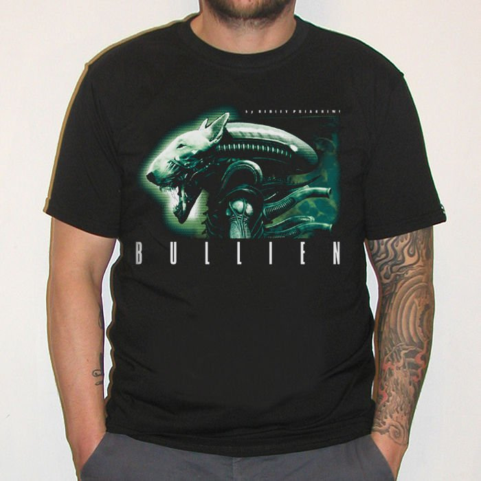 Bullterrier als Alien – Der achte Passagier eines bestimmten Raumschiffs :) Wir schreiben das Jahr 2012. Auf dem Planeten Thedus gehen die Vorräte an angereichertem Erz zur Neige. In einer Nacht, während eines Spaziergangs mit Botox, sieht die Firma PSIAKREW, wie das Raumschiff NOSTROMO auf einem Parkplatz neben einem Supermarkt landet. Im Inneren gibt sich ein Klon von Ellen Ripley schamlosen Praktiken mit einem Bullterrier hin. Man möchte sich kaum ausmalen, was aus dieser Begegnung entstehen könnte. Bullien naht! Tauche ein in eine augenzwinkernde Science-Fiction-Welt mit unserem einzigartigen „BULLIEN“-T-Shirt. Dieses Design ist eine kreative Mischung aus dem legendären Xenomorph aus Alien und der markanten Silhouette eines Bullterriers. Das Ergebnis? Ein zugleich bedrohliches und humorvolles Motiv, das garantiert für Aufsehen sorgt – und für ein Schmunzeln.