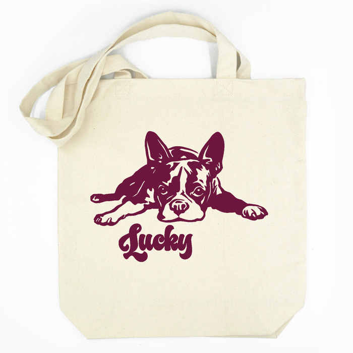 Personalisierte ECO-Baumwolltasche – Boston Terrier in Ecru mit Namen – Psiakrew Tragetasche Bordeaux