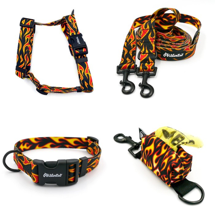 ZESTAW AKCESORIÓW. Pies średni. Seria Dog on Fire Psiakrew; Obroża, Szelki, Smycz, Etui