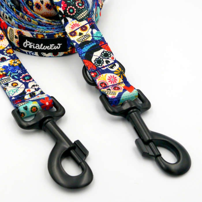 Długa smycz dla psa przepinana Dia de los Muertos Psiakrew, taśma 2,5 cm, karabińczyk 8 cm czarny