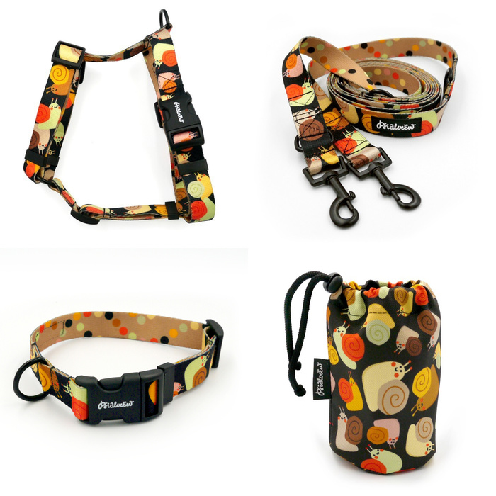 ZESTAW AKCESORIÓW. Pies średni. Rodzinka Ślimaków Psiakrew; Obroża, Szelki, Smycz, Saszetka