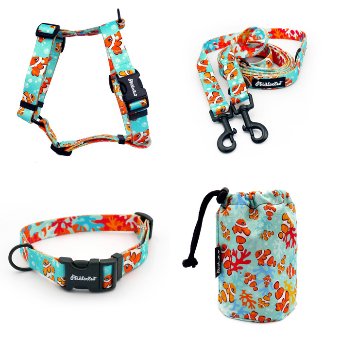 ZESTAW AKCESORIÓW. Pies mały. Seria Błękitna Laguna Psiakrew; Obroża, Szelki, Smycz, Saszetka