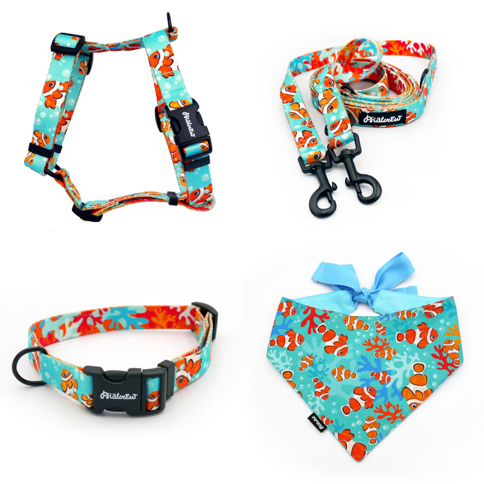 ZESTAW AKCESORIÓW. Pies mały. Seria Błękitna Laguna Psiakrew; Obroża, Szelki, Smycz, Apaszka