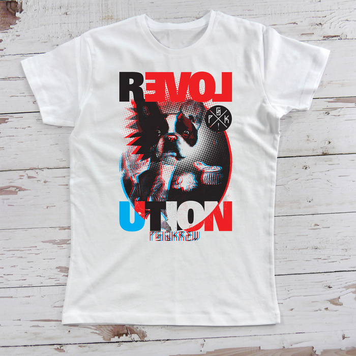 Wyróżnij się z tłumu dzięki naszej unikatowej koszulce „Revolution”! Ten designerski t-shirt w stylu retro z nowoczesnym twistem to prawdziwy manifest mody. Na przodzie znajduje się efektowny nadruk z psem rasy buldog francuski, wykonany w technice rastrowej z efektem 3D (anaglif – czerwono-niebieski). Kompozycję uzupełnia odważny napis „REVOLUTION”, którego litery zostały kreatywnie rozłożone i zaakcentowane kolorami: czarnym, czerwonym i niebieskim.
