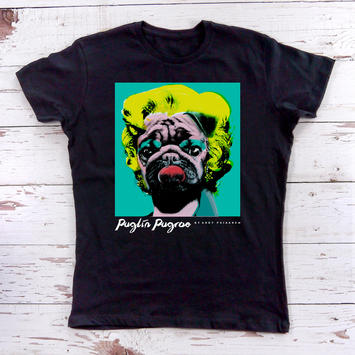 Sztuka i humor w jednym? Przedstawiamy koszulkę „Puglin Pugroe” – idealną propozycję dla miłośników psów, sztuki i oryginalnego stylu! Na czarnym tle wyróżnia się kolorowy nadruk inspirowany pop-artem Andy'ego Warhola, z uroczym mopsem ucharakteryzowanym na ikonę stylu lat 60. Mops z blond fryzurą à la Marilyn Monroe!