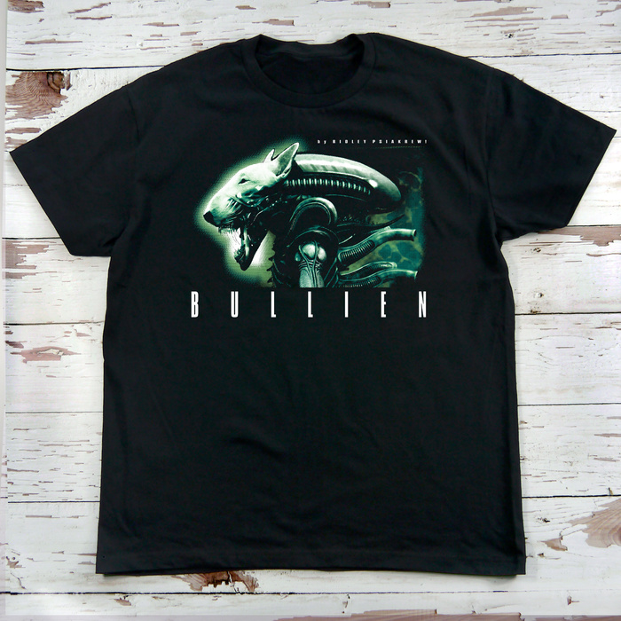 Bull Terrier jako Obcy Ósmy pasażer pewnego kosmicznego statku :) Jest rok 2012. Na planecie Thedus kończą się złoża wzbogaconej rudy. Firma PSIAKREW w nocy, podczas spaceru z Botoxem widzi jak koło Biedronki na parkingu ląduje NOSTROMO, a w nim klon Ellen Ripley oddaje się lubieżnym praktykom z Bull Terrierem, aż strach pomyśleć, co wyniknie z tego spotkania. Nadchodzi Bullien! Przenieś się do świata science fiction z przymrużeniem oka dzięki naszej unikalnej koszulce „BULLIEN”. Ten projekt to kreatywne połączenie kultowego ksenomorfa z filmu „Alien” z charakterystyczną sylwetką bulteriera. Efekt? Groźny, a zarazem zabawny motyw, który przyciąga uwagę i wywołuje uśmiech.